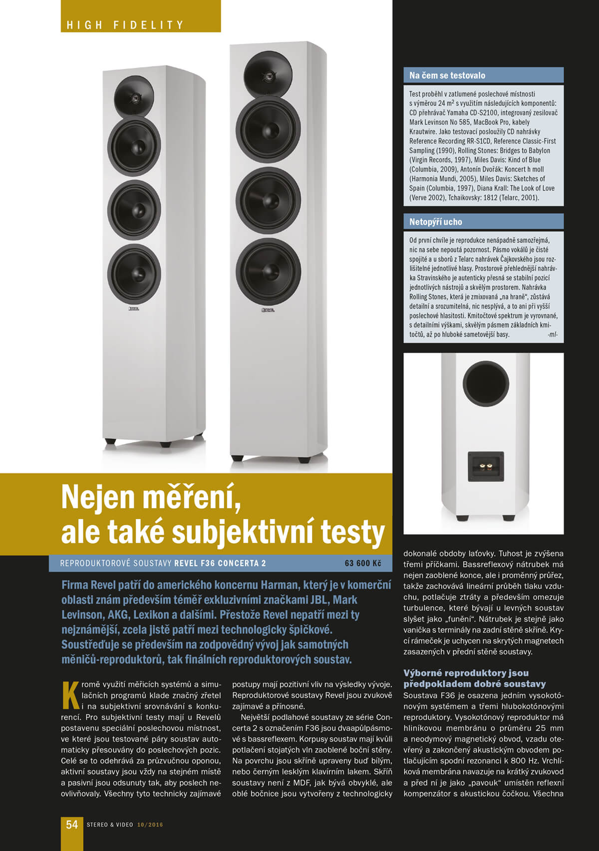 Kromě využití měřicích systémů a simulačních programů klade značný zřetel i na subjektivní srovnávání s konkurencí. Pro subjektivní testy mají u Revelů postavenu speciální poslechovou místnost, ve které jsou testované páry soustav automaticky přesouvány do poslechových pozic. Celé se to odehrává za průzvučnou oponou, aktivní soustavy jsou vždy na stejném místě a pasivní jsou odsunuty tak, aby poslech neovlivňovaly. Všechny tyto technicky zajímavé postupy mají pozitivní vliv na výsledky vývoje. Reproduktorové soustavy Revel jsou zvukově zajímavé a přínosné. Největší podlahové soustavy ze série Concerta 2 s označením F36 jsou dvaapůlpásmové s bassreflexem. Korpusy soustav mají kvůli potlačení stojatých vln zaoblené boční stěny. Na povrchu jsou skříně upraveny buď bílým, nebo černým lesklým klavírním lakem. Skříň soustavy není z MDF, jak bývá obvyklé, ale oblé bočnice jsou vytvořeny z technologicky
